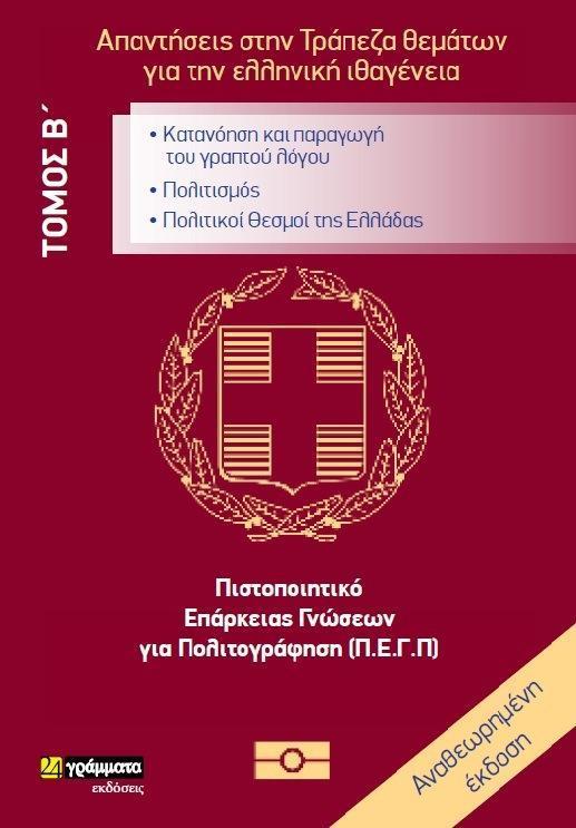 Απαντήσεις στην Τράπεζα θεμάτων για την ελληνική ιθαγένεια Πιστοποιητικό Επάρκειας Γνώσεων για Πολιτογράφηση (Π.Ε.Γ.Π) αναλυτική και ταξινομημένη επιμέλεια των εκφωνήσεων και στη συνέχεια υποδειγματική απάντηση τους (952 σελ. Α” και Β” τρόμος) Τόμος Α΄ (σελ. 242) Τόμος Β’ Κατανόηση του προφορικού λόγου, Γεωγραφία,