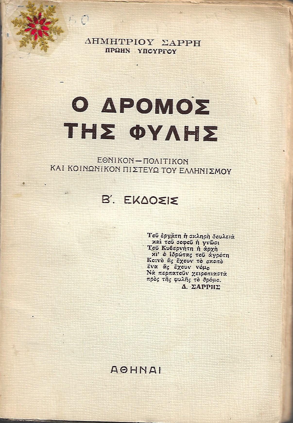 Λόγω της εξαιρετικής υποδοχής της οποίας έτυχεν η πρώτη εκδόσις του έργου τούτου, εξαντληθέντος εντός τριμήνου από της κυκλοφορίας του και της συνεχιζόμενης αθρόας ζητήσεως του,προέβημεν εις την επανεκδοσιν του <<ΔΡΟΜΟΥ ΤΗΣ ΦΥΛΗΣ>> διά να ικανοποιήσωμεν τας απαιτήσεις του Ελληνικού κοινού,εις την ψυχή του οποίου τοσαύτην απηχησιν έσχεν το βιβλιίον τούτο, γεγονός το οποίον μας συνεκίνησεν βαθύτατα. Τέλος, επί τη ευκαιρία της δευτέρας ταύτης εκδόσεως, αισθανόμεθα την ανάγκη να εκφράσωμεν την βαθείαν ευγνωμοσύνην μας προς όλους εκείνους οι οποίοι παντοιοτρόπως ενίσχυσαν την εθνικήν μας ταύτην προσπάθειαν.