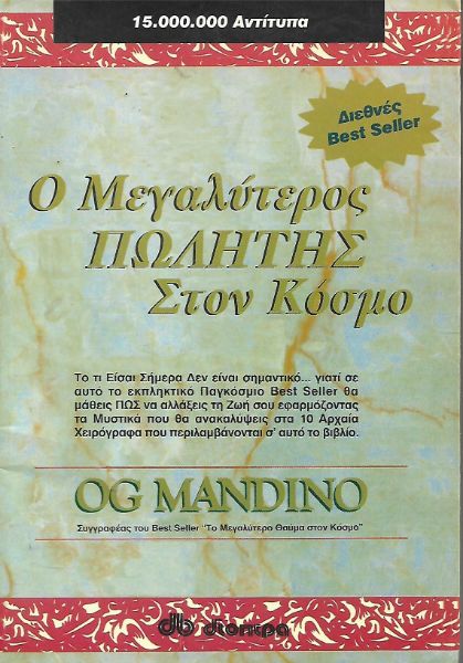 Τώρα μπορείτε να ανακαλύψετε και εσείς τα μυστικά που θα αλλάξουν τη ζωή σας με το βιβλίο που κρατάτε στα χέρια σας. "Ο μεγαλύτερος πωλητής στον κόσμο" είναι το έργο που έχει επηρεάσει τη ζωή χιλιάδων ανθρώπων. "Θα επιμείνω μέχρι να πετύχω... Δε γεννήθηκα σ' αυτό τον κόσμο για να αποτύχω, ούτε τρέχει η αποτυχία στις φλέβες μου... Δεν είμαι πρόβατο που περιμένει να το κεντρίσει ο τσοπάνης. Είμαι ένα λιοντάρι και αρνούμαι να μιλώ, να βαδίζω, να κοιμάμαι με πρόβατα... Το σφαγείο της αποτυχίας δεν είναι δικό μου πεπρωμένο... Θα επιμείνω μέχρι να πετύχω". (Από τις Αρχαίες Περγαμηνές ΙΙΙ) Μεταμορφώστε τη ζωή σας και ανακαλύψτε την αληθινή πληρότητα με την ανεκτίμητη σοφία των 10 Περγαμηνών που περιλαμβάνονται στο βιβλίο.